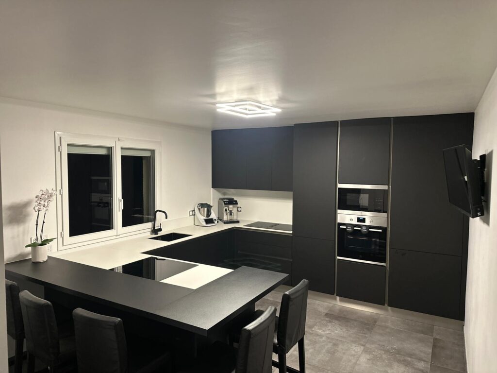 Découvrez une de nos dernières réalisations, une cuisine qui allie un design audacieux et une fonctionnalité irréprochable. Ce projet met en scène une combinaison sophistiquée de matériaux pour créer un espace unique...