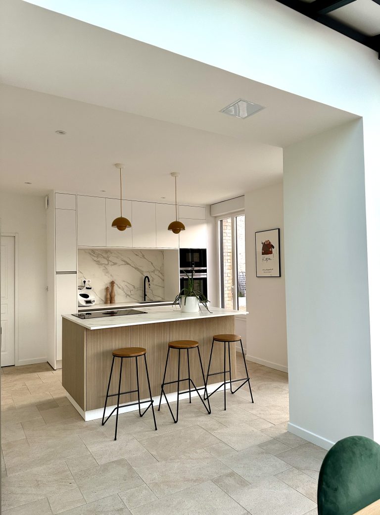 - L’Îlot Central, Pièce Maîtresse : À la fois fonctionnel et esthétique, l’îlot en bois strié avec son plan de travail en Neolith devient le point focal de la cuisine. Il intègre harmonieusement la zone de cuisson et offre un espace convivial pour les repas informels ou les échanges.