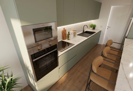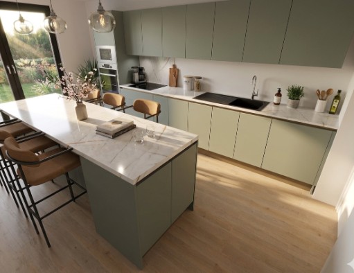 Pour cette cuisine à Marne-la-Vallée, l’implantation a été optimisée pour maximiser la convivialité et la fluidité de passage. L’élément central du projet est un large îlot dînatoire qui sert à la fois de zone de préparation et d’espace de repas, idéal pour les familles du Val d’Europe. Le contraste entre les façades vert sauge mat et le plan de travail aspect marbre veiné apporte une touche de luxe discret, typique des créations que nous présentons dans notre showroom de Chessy.