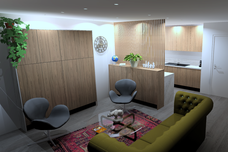 L’agencement intelligent et la séparation visuelle en tasseaux de bois optimisent l’espace, reliant harmonieusement cuisine et séjour. Une alliance parfaite de matériaux premium et de conception astucieuse pour un intérieur à votre image.